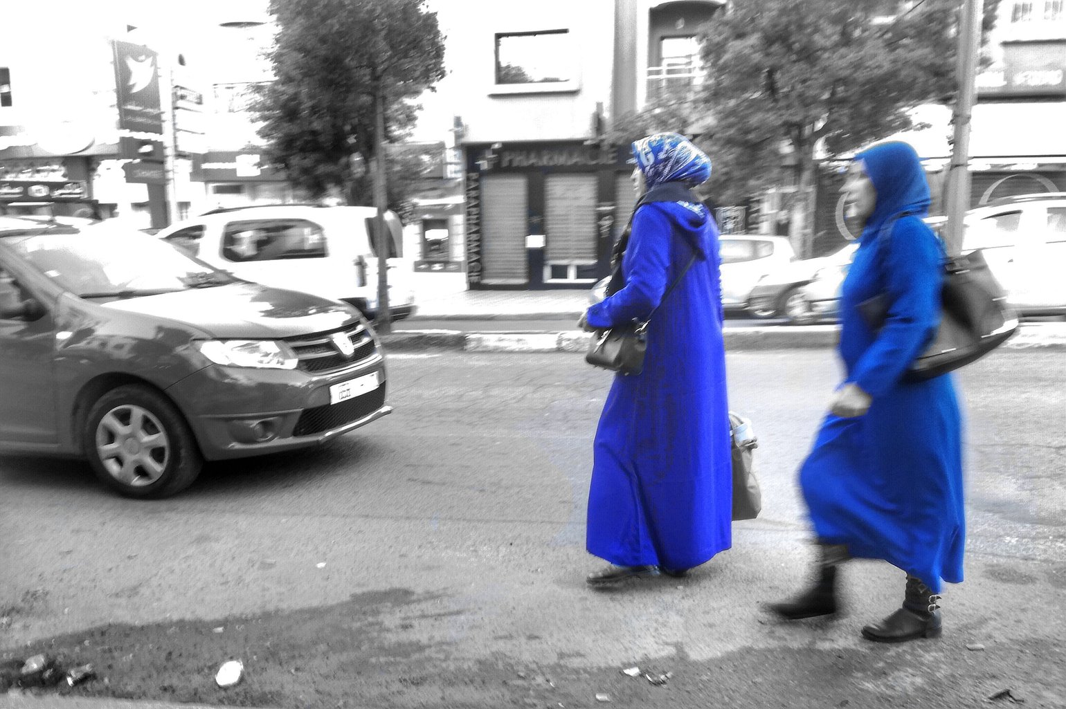 Abderrahim I was going and I saw a woman wearing blue, I went some meters then found another woman wearing blue, then I walked back with her till they are together , in the end it is blurry :D