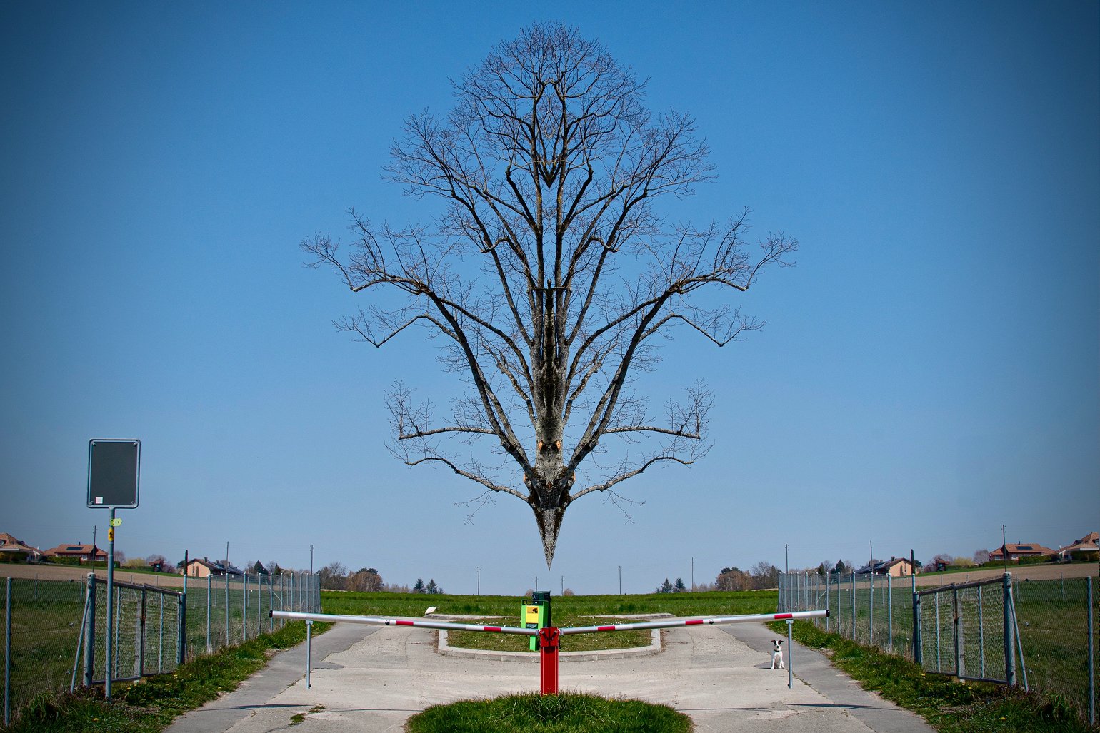 bartez83 1.sign no 1 2. sign no 2 3. dog 4. red strap on the barrier 5. cleaned pathway 6. white spot on the left 7. object behind the green sign. 😁