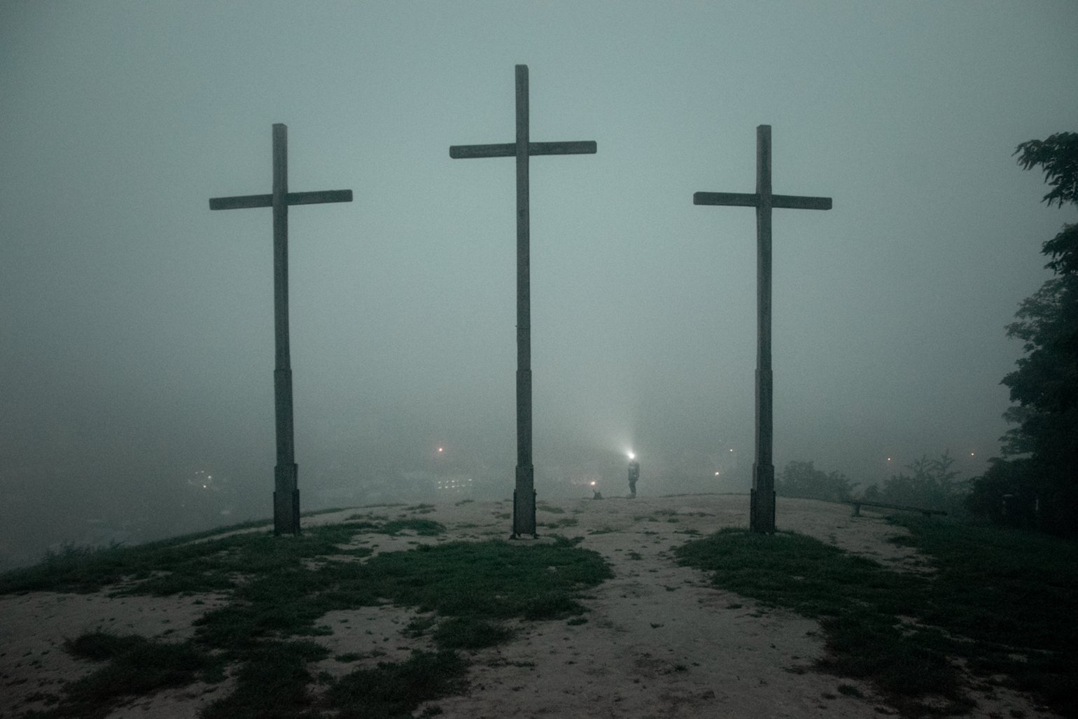 Basia Widok z Góry Trzech Krzyży jest na zachód, o wschodzie czasem w dole snują się mgiełki tworząc baśniowy pejzaż